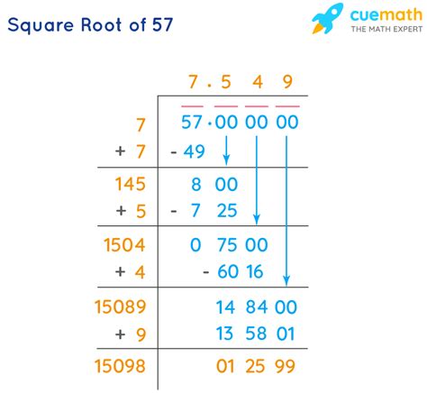 Next, let's refine our estimate by considering decimals. We can try 7.5. Squaring 7.5 (7.5 * 7.5) gives us 56.25. This is quite close to 57! Now, let's try 7.6. Squaring 7.6 (7.6 * 7.6) results in 57.76. This is slightly above 57. So, we've narrowed it down further: the square root of 57 lies between 7.5 and 7.6.